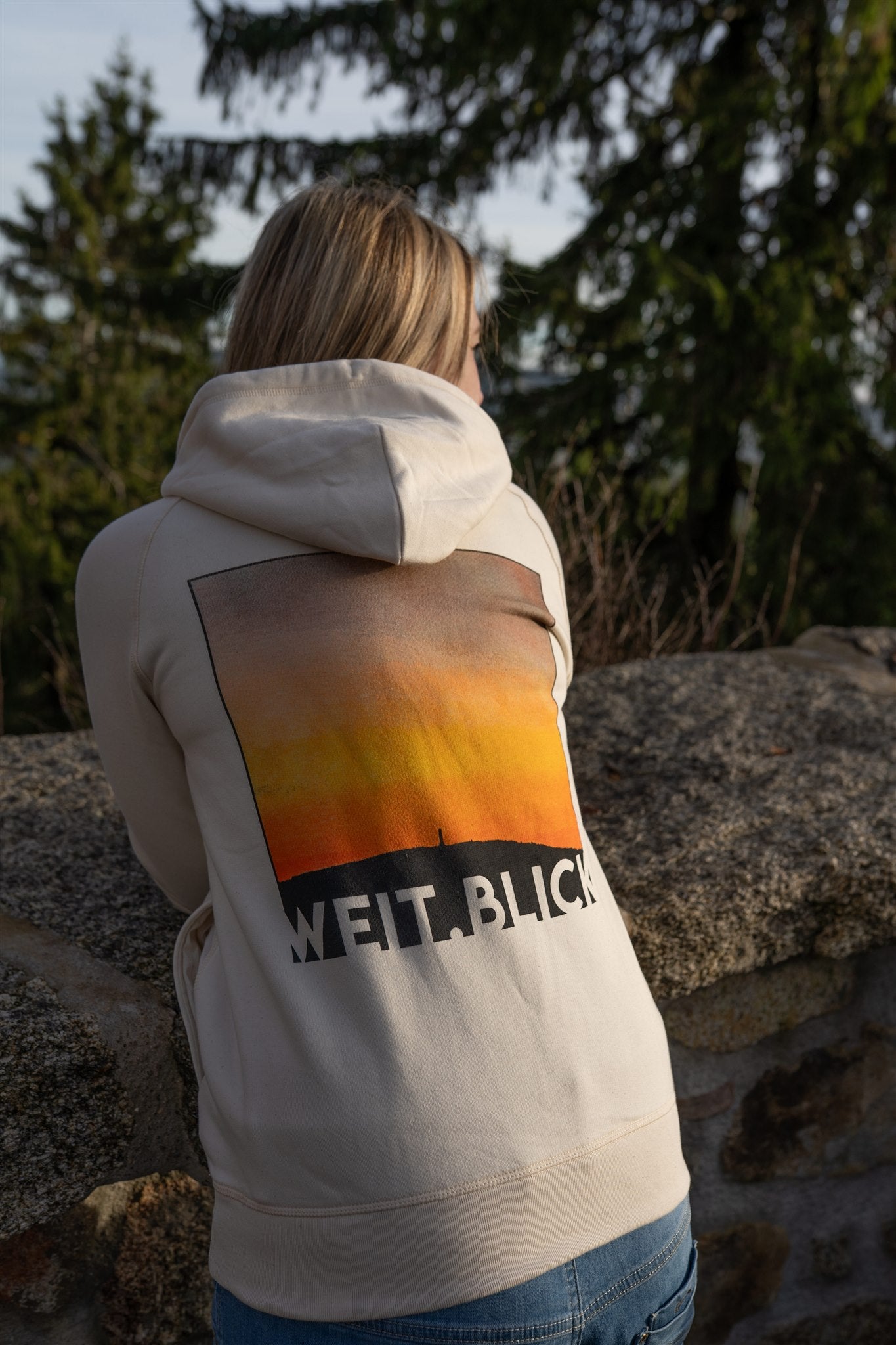 WEIT.BLICK  Unser WEIT.BLICK Hoodie 4-farbiger Siebdruck. Jedes Shirt ist ein Unikat und kann in Farbintensität und Druckgenauigkeit abweichen  Shell: Aufgerautes Sweatshirt, 85 % Baumwolle – ringgesponnen, gekömmt, 15 % recyceltes Polyester, Vorgewaschen, Weicher Griff. Das Sweatshirts ist vegan, und erfüllt Oko-Tex Standard sowie GOTS Kriterien. ---  Limitierte Auflage - echtes HANDWERK Weil...